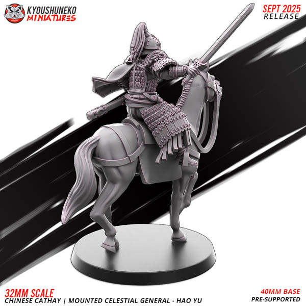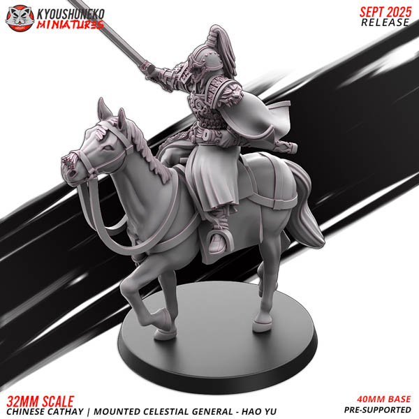 Oferujemy zestaw (1 figurka) Mounted Celestial Sword General Hao Yu od Kyoushuneko Miniatures z ich kolekcji Chinese Cathay, wydrukowany na drukarce żywicznej