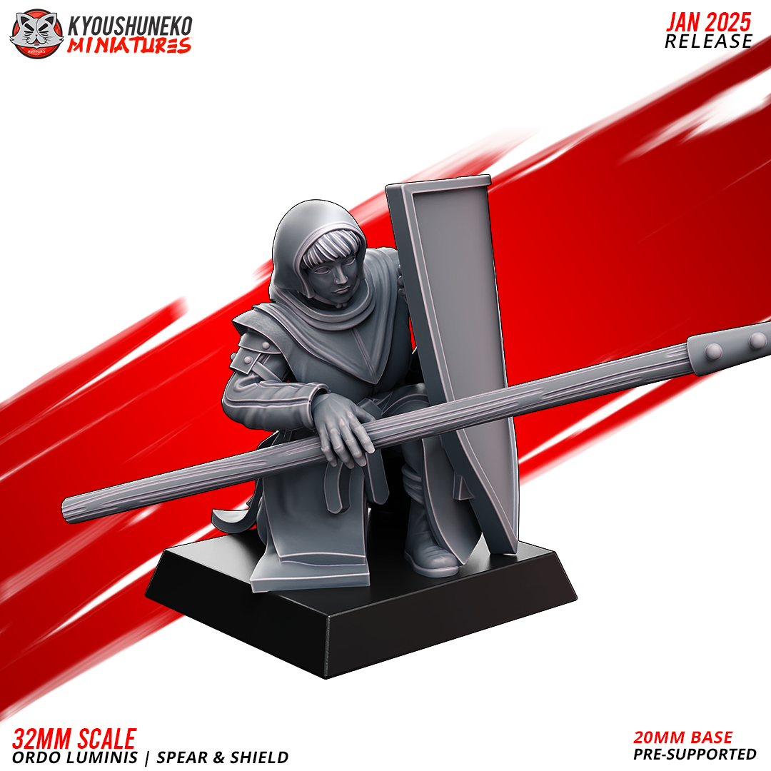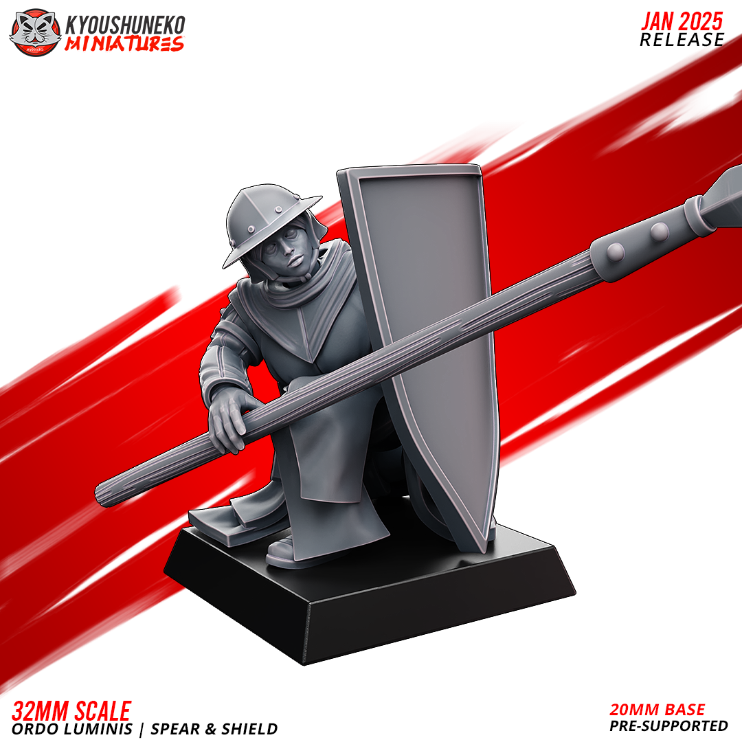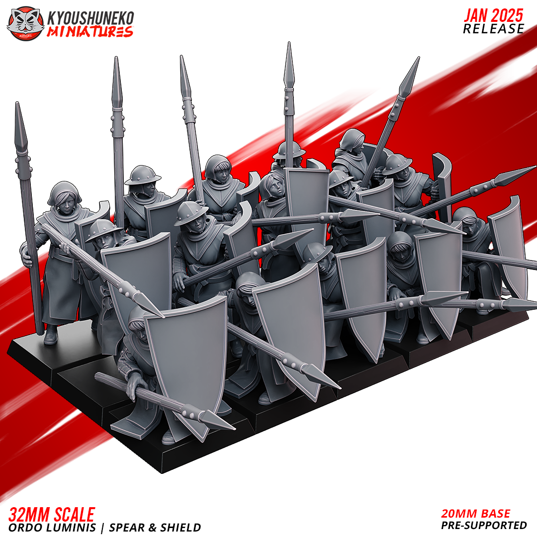 Oferujemy zestaw (10 figurek) Spear & Shield Infantry od Kyoushuneko Miniatures z ich kolekcji Ordo Luminis, wydrukowany na drukarce żywicznej