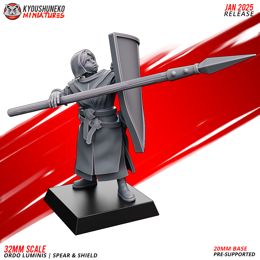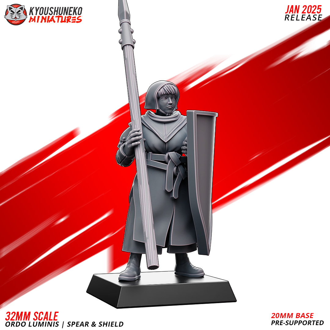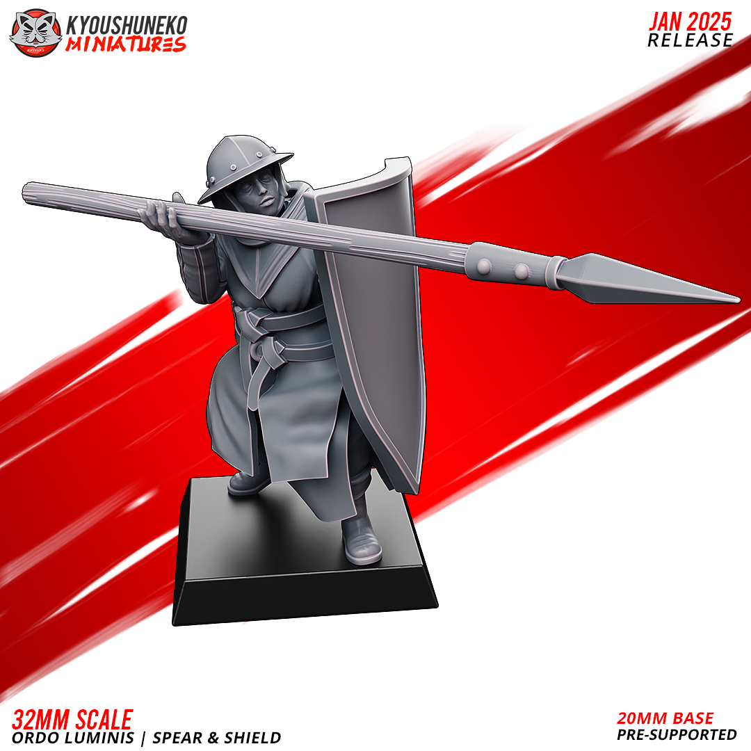Oferujemy zestaw (10 figurek) Spear & Shield Infantry od Kyoushuneko Miniatures z ich kolekcji Ordo Luminis, wydrukowany na drukarce żywicznej